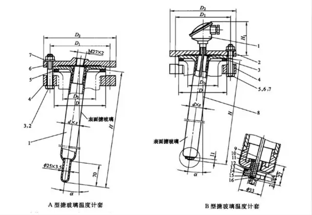 搪玻璃溫度計套管結(jié)構(gòu)一般有A型和B型兩種: